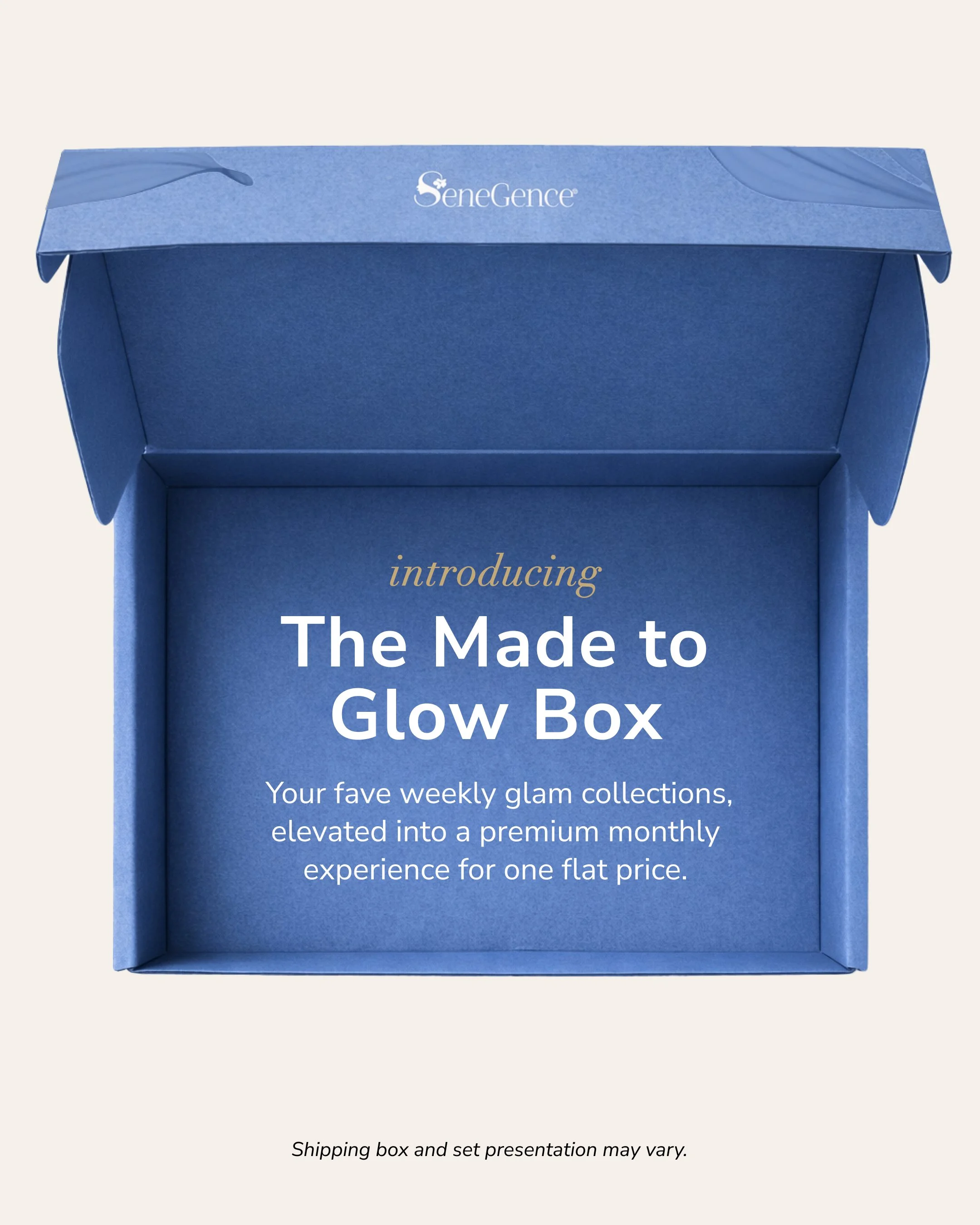 The Made to Glow Box is a monthly beauty subscription by SeneGence that includes the four featured products from the first monthly Glamour Look of the Week (GLOW), plus two additional cosmetic items and a beauty tool or accessory to complete the look.